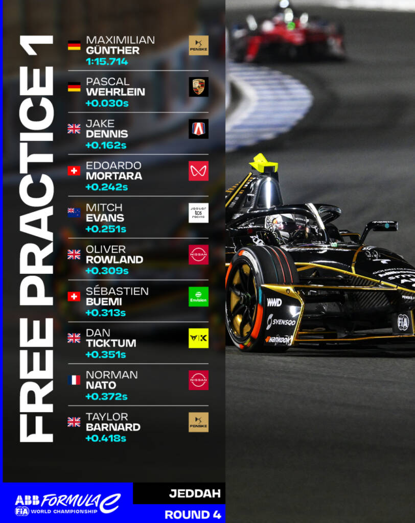 Free Practice 1 rarely defines outcomes on its own, but in Jeddah it has provided meaningful early signals. DS PENSKE and Günther carry momentum into the next phase, yet Porsche, Jaguar, Andretti, Mahindra, Nissan, Envision and CUPRA KIRO all appear firmly within the competitive window. As attention now turns to Free Practice 2, the expectation is less about outright breakthroughs and more about refinement — managing traffic, optimising energy deployment and extracting precision on a circuit where the margins are already razor-thin.