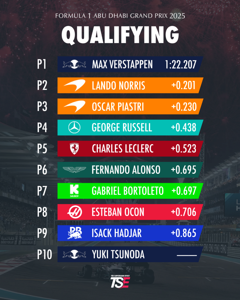 What is certain is that Abu Dhabi is set for one of the most finely balanced finales in years. Verstappen takes Abu Dhabi pole, but with Norris and Piastri right behind and a hungry pack of midfield cars waiting to pounce, Sunday’s title decider is wide open.